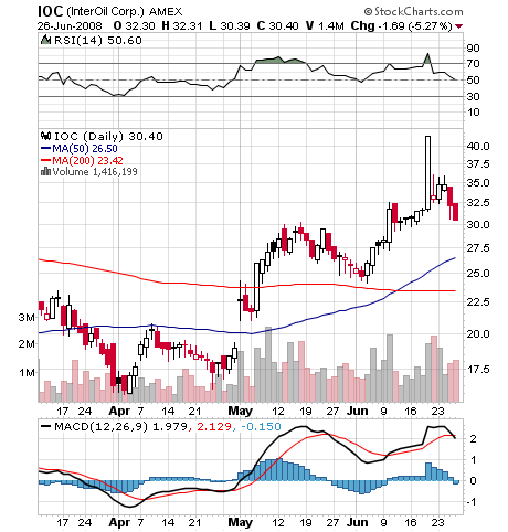 InterOil has taken a bit of a hit, from a high of 35.8 (if one doesn’t consider that one VERY big order at 41.62) to just above $30.40 Thursday at the close. Should we worry?