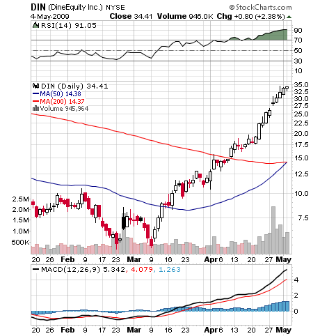 The point is, this rather unusual graph has consequences for other stocks we follow. Normally, we would say that they are getting a bit overbought, but that’s what we would have said on April 21 about DineEquity, which then set off to double again in a mere ten trading days..