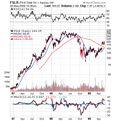 Bad news for First Solar is good news for the poly based companies, like Suntech (STP) and Trina Solar (TSL). These have had nice runups, despite falling prices for their panels. Cancelling their plans for their own polysilicon plant turned out to be a good move for Trina Solar.
