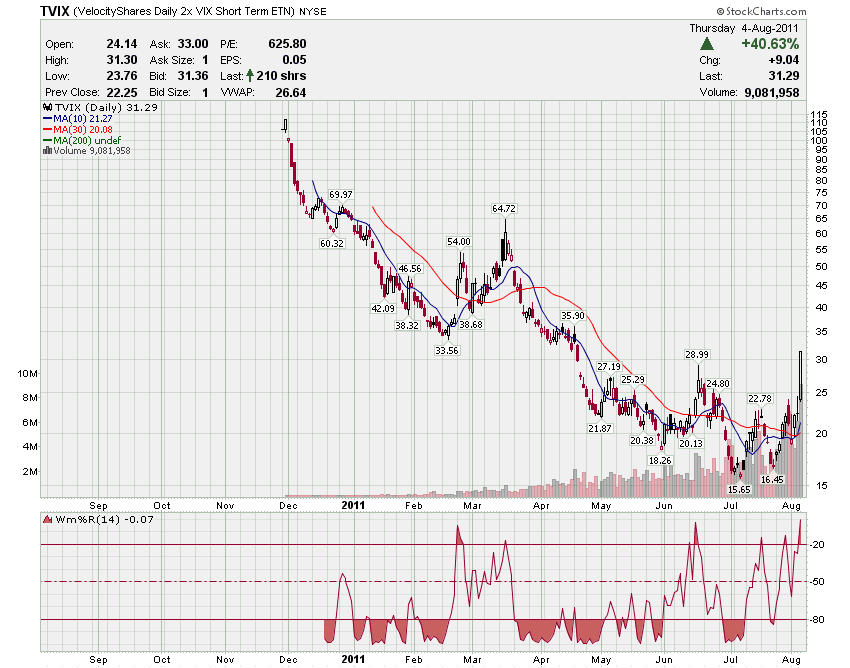 First, you can’t trade the VIX directly. You can either buy futures, or a host of ETF and ETN related products. Not to complicate things unnecessary, we’ll concentrate on two of them, VXX (the oldest VIX ETF) and TVIX, the relatively new daily 2X VIX ETF. TVIX gives you approximately twice the bang for your buck compared to VXX.